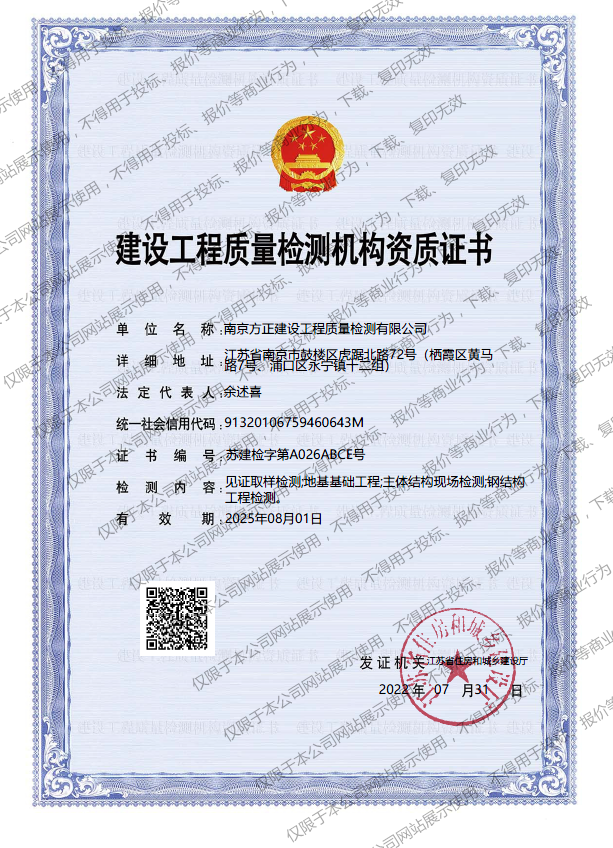 南京方正建設工程質量檢測有限公司是1989年省建設廳批準成立的具有獨立法人資格的專業工程質量鑒定及檢測機構,具有中國合格評定國家認可委員會實驗室認可CNAS資質、省建設廳核準的見證取樣類檢測、專項類檢測及備案類檢測資質,省質量技術監督局資質認定CMA資質,省地理測繪信息局測繪資質,被省建設廳評為2010年度、2011年度、2012年度A級信用等級單位,是入選《全省中小學校舍安全工程抗震鑒定機構名錄》的鑒定機構, 是入選江蘇省人民法院委托鑒定機構電子信息平臺的鑒定機構...